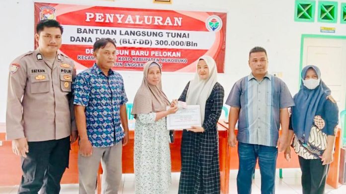Pemerintah Desa (Pemdes) Dusun Baru Pelokan,Kecematan XlV Koto,Kabupaten Mukomuko Menyalurkan Blt -DD Triwulan Pertama kepada 15 KPM sebesar 900 Ribu untuk Januari,Febuari,Maret diaula Kantor Desa Pelokan. Kamis ,27 Maret 2025.