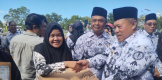 Bupati Mukomuko Choirul Huda Serahkan Laptop untuk Guru pada Upacara Hari...